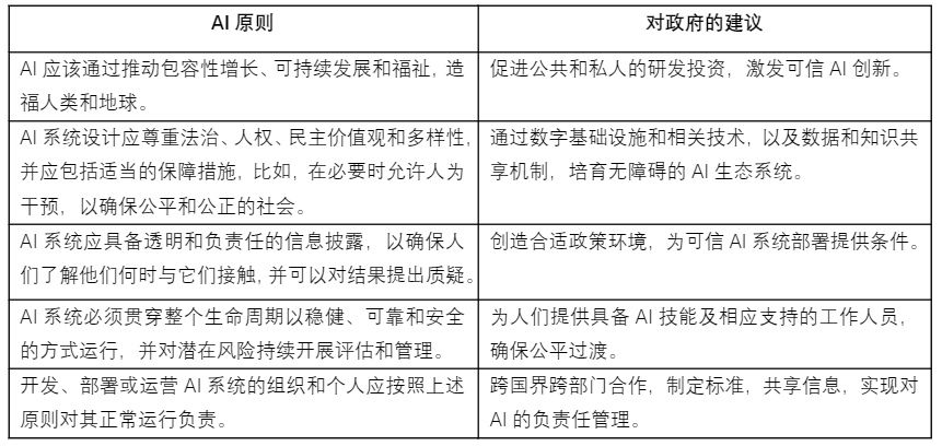 OECD和G20于2019年通过的AI原则,成为政府和组织建构以人为本的可信AI方法的全球基准。这些原则于2016年开始的有关AI使用应遵循的核心道德原则的公开讨论之后制定,原则涵盖了诸如确保AI的好处在社会广泛传播、AI不破坏诸如保护人权等社会保障措施,以及使用AI的组织是否已建立适当的治理和问责制度等方面。下表是OECD的AI原则及其对政府政策制定的建议。